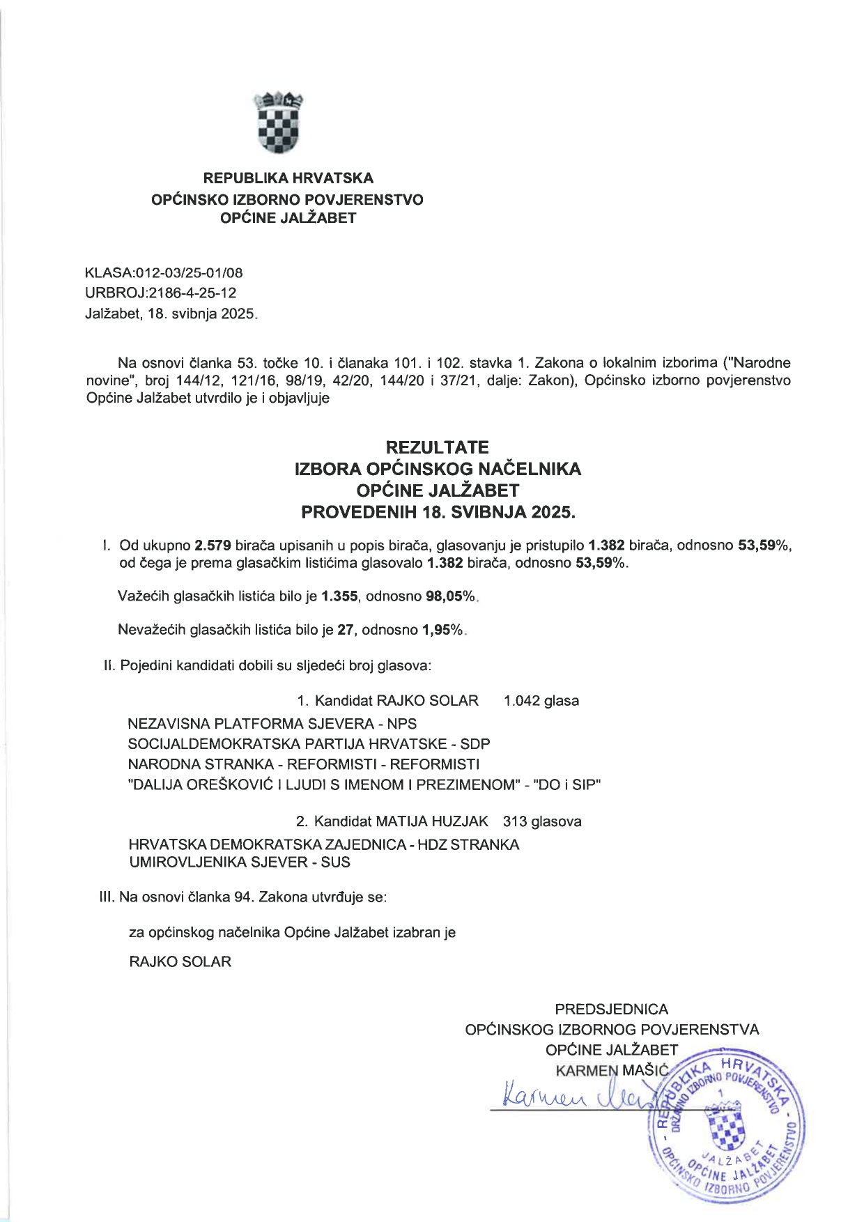 Rezultati izbora za Općinskog načelnika Općine Jalžabet provedenih 18. 5. 2025. godine