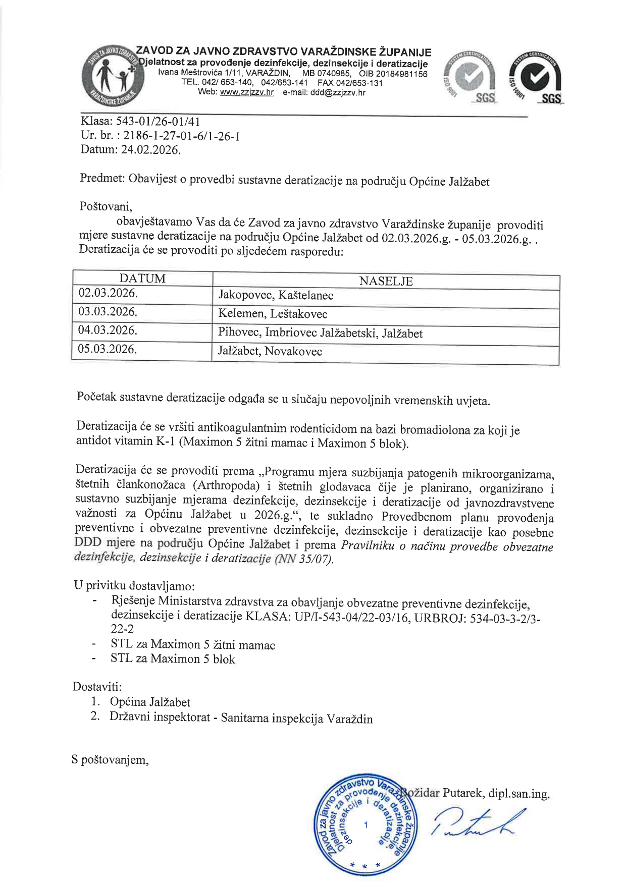 REPUBLIKA HRVATSKA VARAŽDINSKA ŽUPANIJA OPĆINA JALŽABET OPĆINSKI NAČELNIK KLASA: 320-02/26-01/1 URBROJ: 2186-4-02-1-26-2 U Jalžabetu, 16. 3. 2026. godine Temeljem Odluke o subvencioniranju poljoprivredne i stočarske proizvodnje u 2026. godini (KLASA: